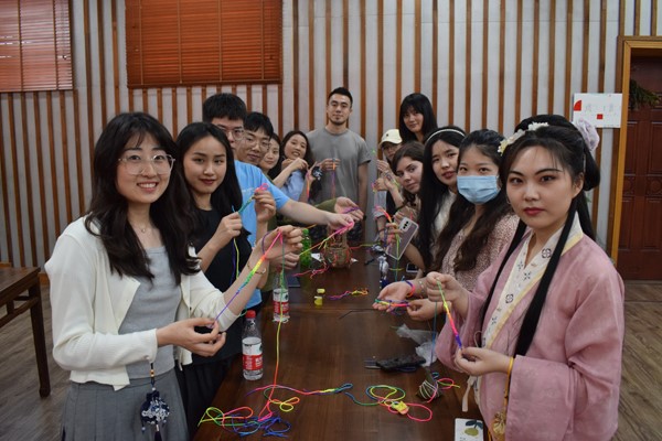 拴系五彩绳有祈福纳吉的美好寓意,是端午节的重要习俗之一。为了体验节日气氛,现场特意准备了精致的五彩绳,并且教同学们如何编制和佩戴五彩绳。中外学子围坐在一起,从最初并不娴熟的手法到不断摸索后成功编好五彩绳,学生们切身感受到了制作的趣味性以及成功的快乐!