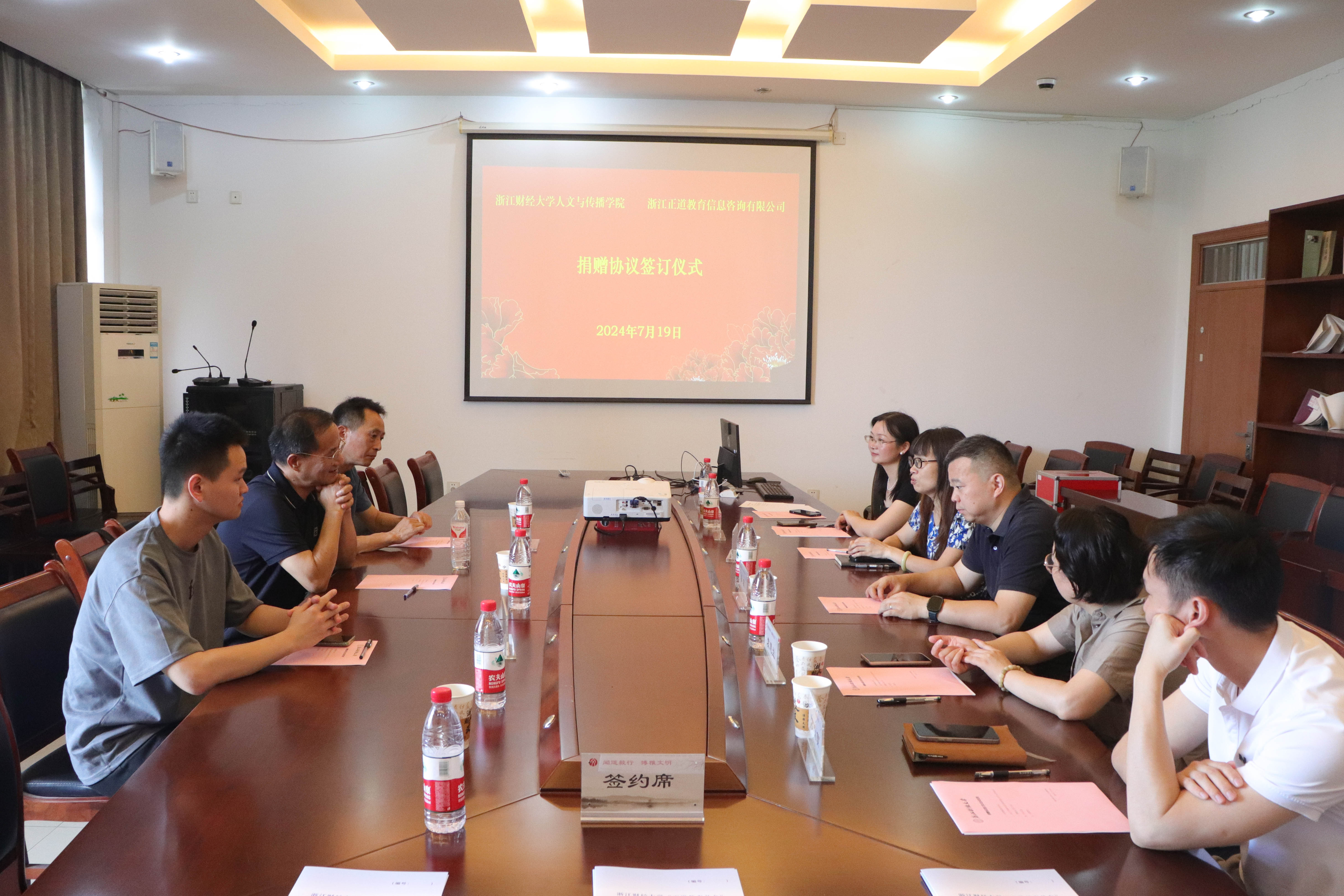 7月19日上午,浙江财经大学“正道教育基金”捐赠仪式在金年会404会议室举行。学院副院长林香娥、副书记袁慧兰、校友办主任吴玻、浙江正道教育信息咨询有限公司董事长沈建芳、乔木老师、叶程刚老师等共同出席签约仪式。