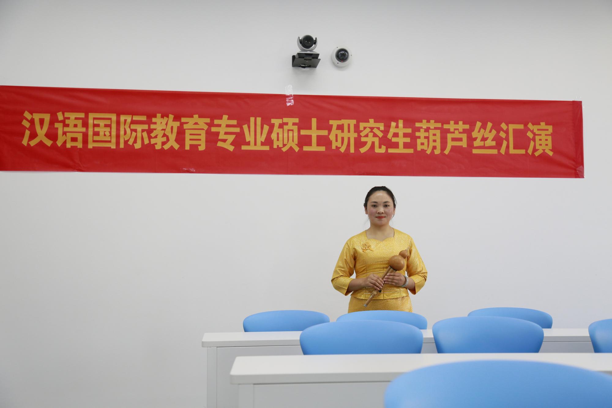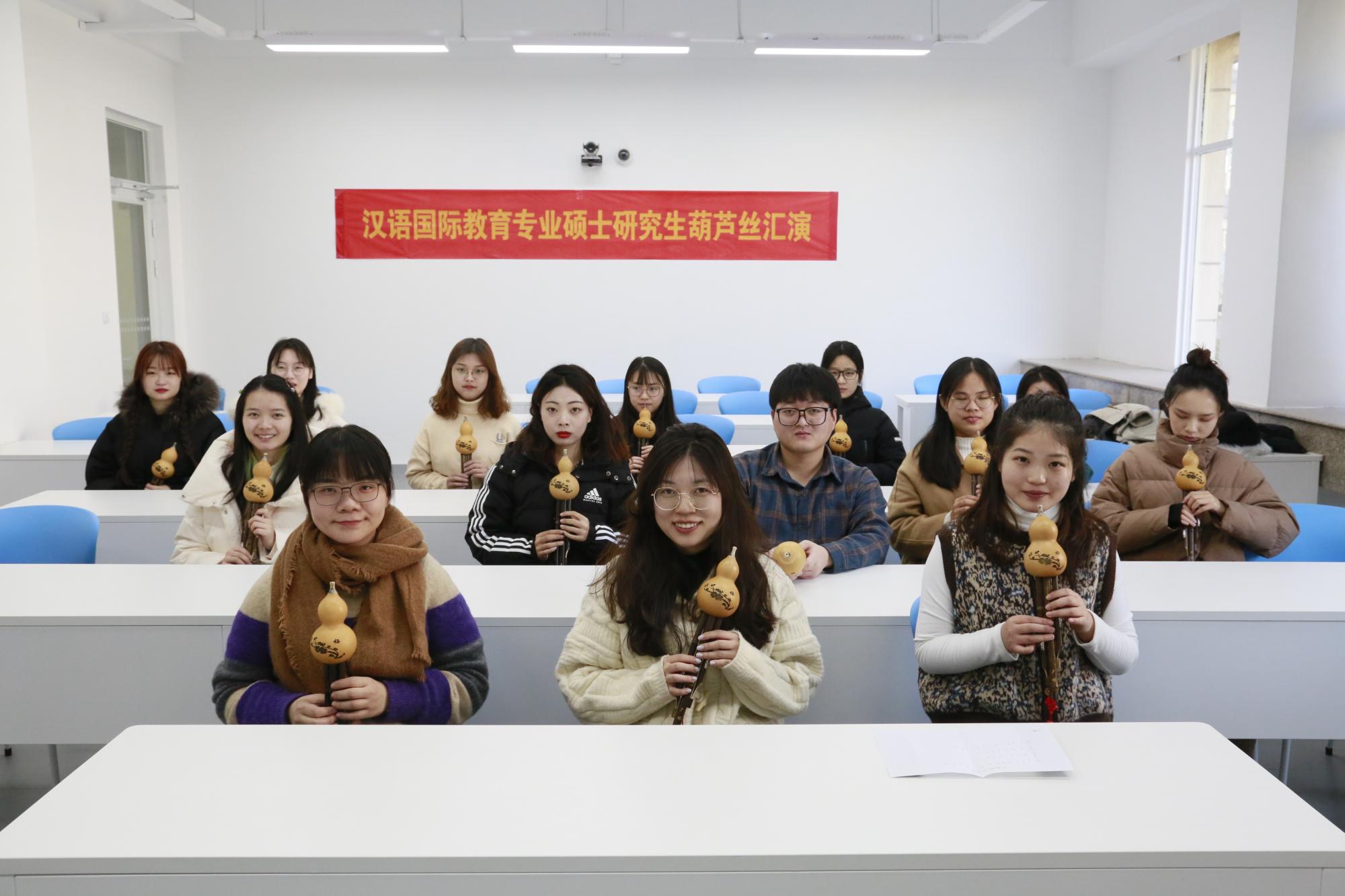 2020年12月31日下午,20级汉语国际教育硕士班全体同学在A205教室进行了“用音乐陶冶情操,课堂乐器演奏会”葫芦丝展示活动,给全体同学一次展示葫芦丝学习成果的机会,付伊老师和张梦平老师一同出席了本次展示活动。同学们展示的节目精彩纷呈形式多样,有独奏、齐奏、歌曲接龙等。演奏了《龙的传人》、《友谊地久天长》、《月光下的凤尾竹》等作品。委婉优雅的丝竹声深情融入听众心间,音色优美、柔和、圆润、婉转,惟妙惟俏。葫芦丝丝丝入扣,葫芦情情深意长,付老师和张老师都为同学们的精彩表演热情鼓掌。