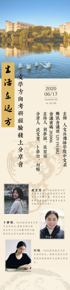 6月7日晚,在中文系副主任胡梦颖老师组织下,“生活在远方”文学方向考研经验线上分享会以腾讯会议形式进行,本场分享会由胡梦颖老师、吴智斌老师主持,邀请到金年会19届汉语言文学专业毕业生武文雯和20届汉语言文学专业毕业生卜梦怡、何畅参与分享。会上,三位学姐不仅分享了自身的备考经历和经验技巧,还向大家介绍了研究生的学习生活,更加坚定了同学们的考研信心。