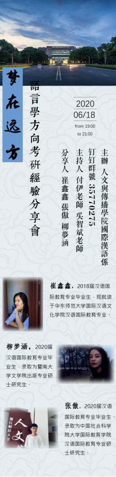 “梦在远方”语言学方向考研经验分享会于6月18日晚成功举行,本场分享会由国际汉语系主任付伊老师组织并由铁徽老师主持,邀请到金年会18届汉语国际教育专业毕业生崔鑫鑫和20届汉语国际教育专业毕业生柳梦涵、张傲同学参与分享。在会上,学长学姐们根据个人情况围绕着择校标准、备考建议和备考心态这些方面,向大家分享了自己是如何确定目标院校,怎样规划备考时间,怎样克服备考困难的心路历程,并一一解答同学们的提问。