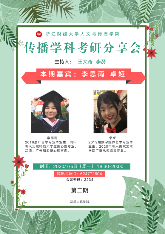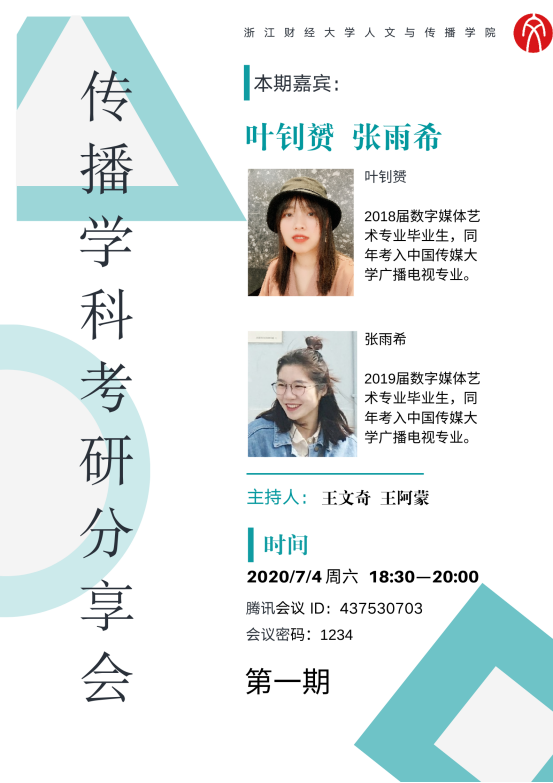传播学方向考研分享会在数字媒体系主任王文奇老师组织下共分为两场进行。第一场于7月4日晚举办,由王文奇老师、王阿蒙老师共同主持,金年会18届数字媒体艺术专业毕业生叶钊赟、19届数字媒体艺术专业毕业生张雨希同学参与分享,本场分享会以中国传媒大学为考研主题院校,鼓励备考学子向着更高远的目标冲刺。第二场分享会于7月6日晚进行,由王文奇老师、李漪老师共同主持,19届广告学专业毕业生李思雨和19届数字媒体艺术专业毕业生卓娅参与分享,本场分享会重点把握基础学科,分享二战告捷的历程经验。