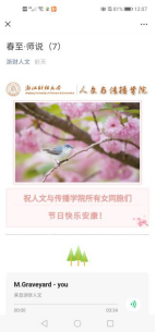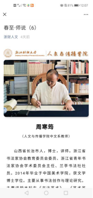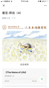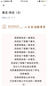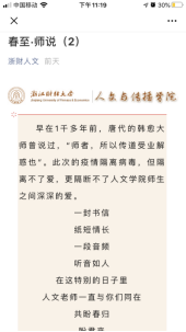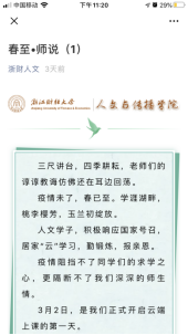 疫情期间,学院党委因势利导,发挥互联网新媒体传播优势,组织开展网络思政教育,发起“春至·师说”专栏活动,实现停课不停教,隔离不割爱。自3月2日起,该院先后邀请院内18位一线教师和院外5位社会导师过网络向学生们寄予真切关心关怀,共话学生成长,将老师们对学生的谆谆教导传递给居家学习的大学生们。截止3月9日,“浙财人文”公众号累计登载8期,累计点击率达5300多人次,成为该院大学生们每日一道成长“大餐”,收到了良好教育效果和社会反响。