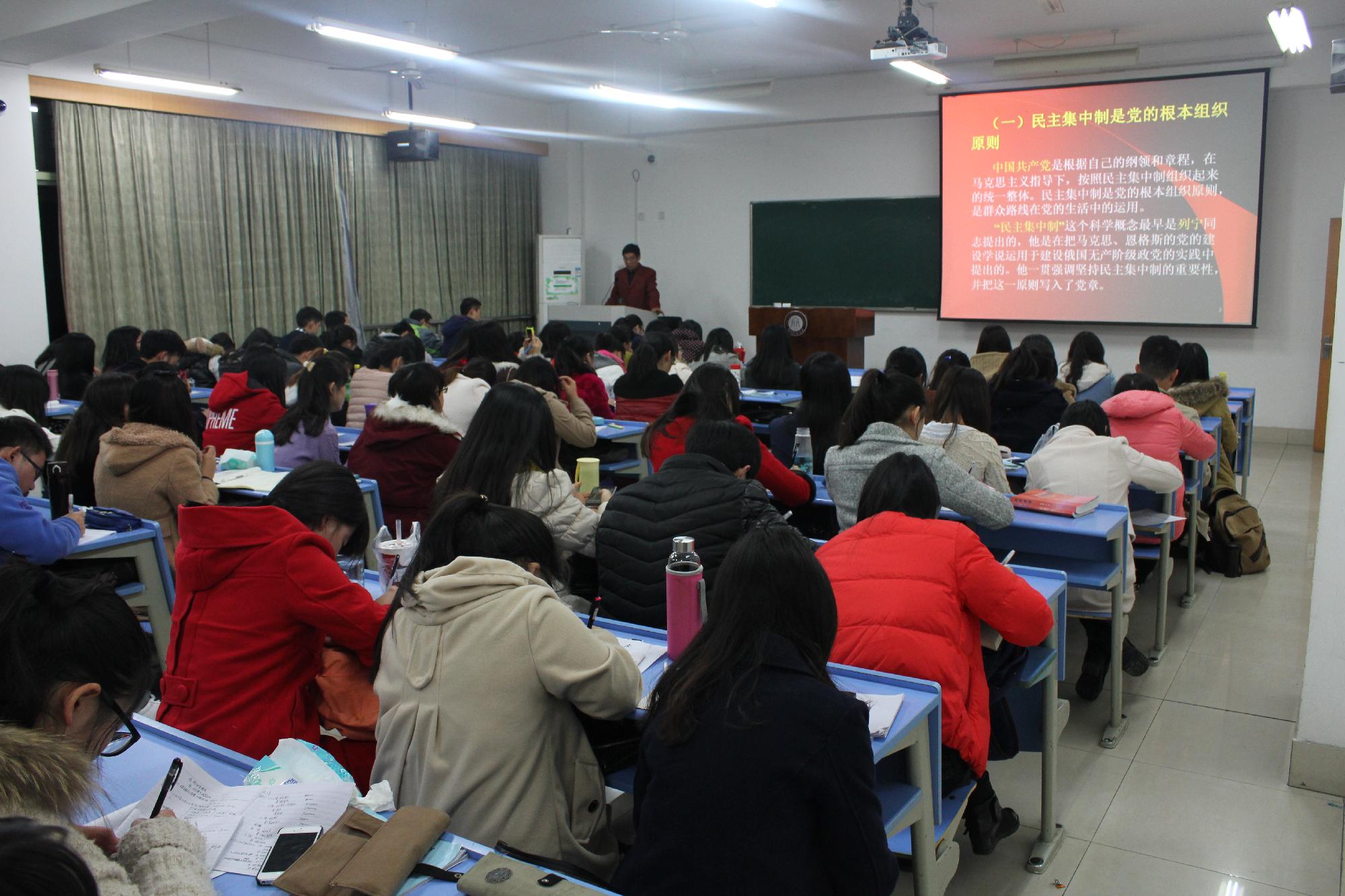 本期培训班共安排5次党课,每节课大家都积极参加,听课期间认真做笔记。金年会邀请了校内外五名主讲老师,他们围绕了多个角度、多个主题进行全方位授课。12月6日下午,首先,来自思政部的总支副书记何历宇老师,结合了习近平总书记的讲话内容,围绕“坚持中国特色社会主义道路”的主题,用GDP等各种数值对比了中国与多个国家的经济发展差别,从而了解到我国经济发展的优点和缺点在哪些方面。接着,校党委组织部副部长范建峰老师向大家阐明了“党员的权利、义务和共产党员的修养问题”,并且讲述当今中国的社会现状、改革开放取得的成就与毛泽东思想之间的关系、为何社会主义是中国的必由之路以及面对改革开放如何看待传统文化,金融学院党总支杨鹰彪书记结合中纪委近年来的惩腐规划以及国际组织发布的清廉指数为大家讲述“党的组织原则、党的纪律以及党风建设”三方面内容。12月9日下午,金年会总支副书记(主持工作)高燕为大家带来了一场关于“明确党员标准,端正入党动机——以实际行动争取早日加入党组织的”的主题讲课,同样是来自金年会的党总支副书记吴玻则讲授了一节关于党员的必修技能,即发展党员工作遵循的方针和原则——“坚持标准,保证质量,改善结构,慎重发展”,他仔细地介绍了发展党员的基本程序的每一个环节,最后,所有听课人员都参加了党课考试进行基本的考核。
