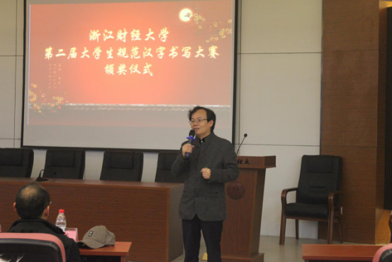 典礼上副校长黄建新教授发表了热情洋溢的讲话。他充分肯定了我校规范汉字书写大赛所取得的成绩,并向给予本次活动大力支持的学涯书法社以及为办好本次书写大赛付出辛勤劳动的同学、老师们表示衷心的感谢,向获奖的同学们表示热烈的祝贺,最后对在座的同学提出了希望。他指出,书法艺术能培养人的浩然正气,也是一个人的第二形象,是中华优秀传统文化的一个重要组成部分,希望同学们从中学习到书法艺术的精髓。同时他也希望大赛能够一年一年地举办下去,让它成为一个文化教育的品牌。