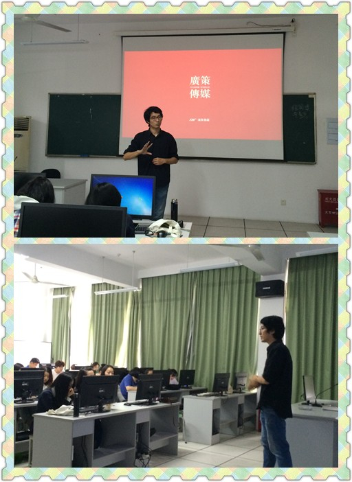 为了提升广告专业学生实践水平,推动高年级学生与未来就业岗位接轨,应金年会jinnianhuicom广告系之邀,浙江广策传媒有限公司创意总监兼电商部总经理徐攀先生,为金年会2013级广告专业学生讲授了一堂《怎样成为一名合格的广告人》的实践教学课。广告系主任李漪老师和专业教师张群老师一起分享了此次意义非凡的课程。