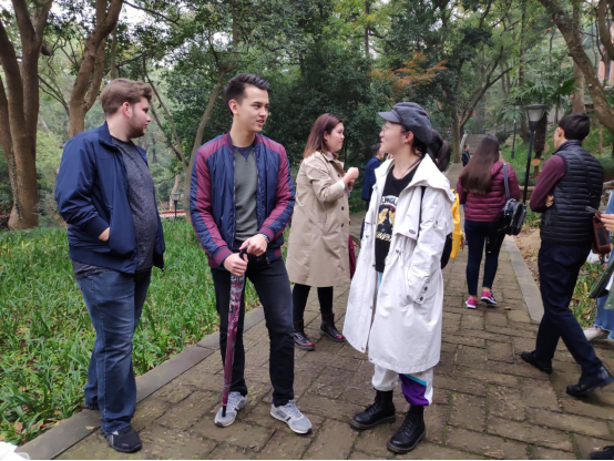 在沙龙举办之前,刘老师就让中国学生对浙大之江校区进行了解,并做了英文介绍的准备。在大巴车上,刘老师带领中外学生进行了简单的联谊活动,互相献歌一曲,并让中外学生互相介绍、交流。达到目的地后,两位老师带领大家观赏了浙大之江校区美丽的近代建筑群,包括钟楼、主楼、小礼堂、具有古罗马建筑痕迹的上红房、司徒雷登曾居住过的下红房等。刘老师向学生们介绍了每一栋等建筑的“前世今生”,使同学们对这所有着深厚民国气息的学校有了更为深刻的认识。中外学生也在“杭州最美校园”中进行了顺畅的交流。