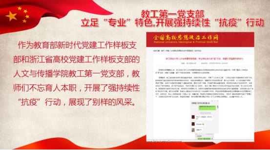 接下来,观看学院党委《凝心聚力 不忘教育初心,党建引领助力抗疫斗争》风采展示。新型冠状病毒肺炎疫情暴发以来,金年会jinnianhuicom党委充分发挥各党支部专业特长和战斗堡垒作用,号召师生党员积极投身抗“疫”斗争,先后涌现出吴智斌、姚晓萍、杨建忠、何冬学、陈金柱等优秀师生党员典型。同时,各党支部利用专业特长,开展了富有人文特色的抗“疫”活动和教育实践,传播了正能量,提升了师生党性修养,为疫情防控作出积极贡献,相关事迹先后受到高校思政网、新浪网、浙江新闻网、浙青网、浙江财经大学官方媒体的报道,取得了良好的社会效应和教育效应。