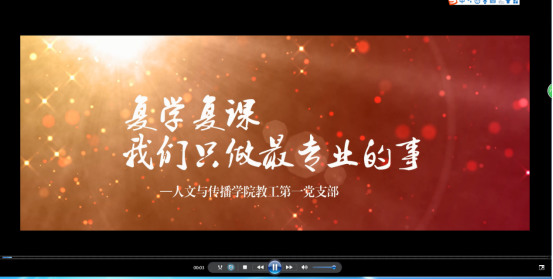 随后,观看《专业特长助力抗“疫”行动,党建引领凝聚支部合力》微党课视频。在“七一”到来之际,教工第一党支部毋丹老师录制了微党课视频,讲述了作为教育部新时代党建工作样板支部和浙江省高校党建工作样板支部的金年会教工第一支部全体党员教师,在疫情期间,不忘教育初心,发挥文学专业特长,开展了“以文字为工具”、“以学生为根本”的强持续性“抗疫”行动,师生互动、家校联动,守护学生成长,真正实现了停课不停学,隔离不隔爱,取得了良好的教育效果,得到了学生家长们的一致肯定。