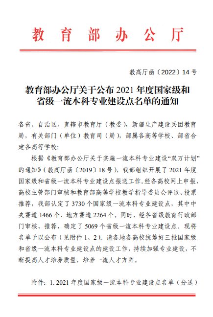 近日,根据《教育部办公厅关于公布2021年度国家级和省级一流本科专业建设点名单的通知》(教高厅函〔2022〕14号),金年会下设的“汉语言文学”和“广告学”分别入选国家级、省级一流本科专业建设点。