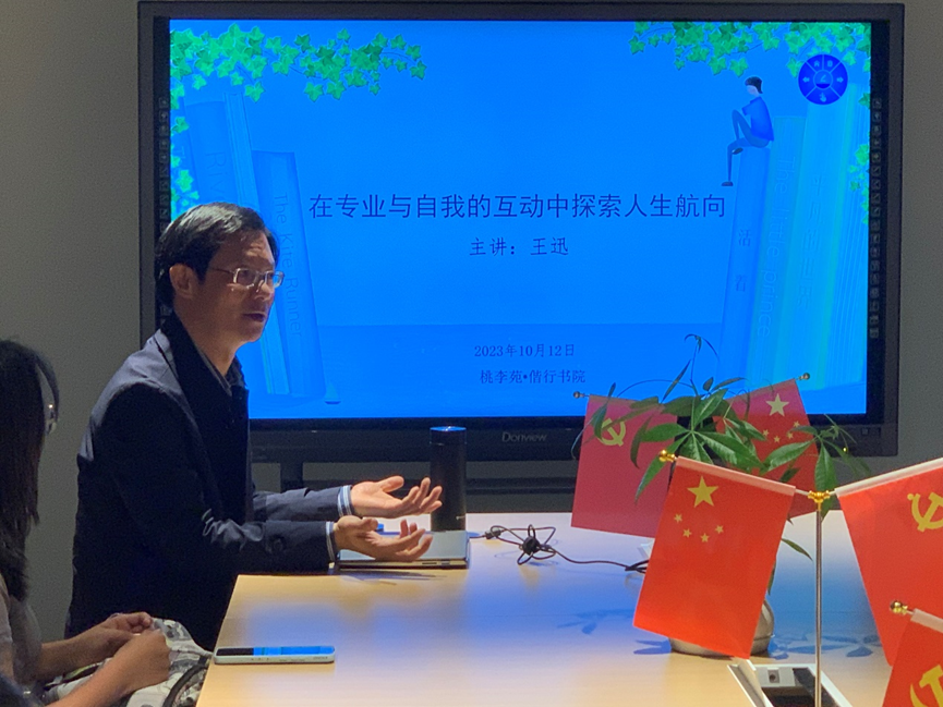 10月12日晚,金年会jinnianhuicom在桃李苑生活园区“偕行书院”举办了第二期“2023级新生始业沙龙”活动。金年会中文系教师、23文学3班班主任王迅作为本次活动的主讲人,以“在专业与自我的互动中探索人生航向”为主题,与同学们展开了关于大学生活的讨论。23文学3班全体同学参与了本次活动。本次沙龙活动是为了帮助大一新生尽快适应大学生活,加强新生对专业、自我、人生规划的认知,同时推进思政工作进园区的进程。