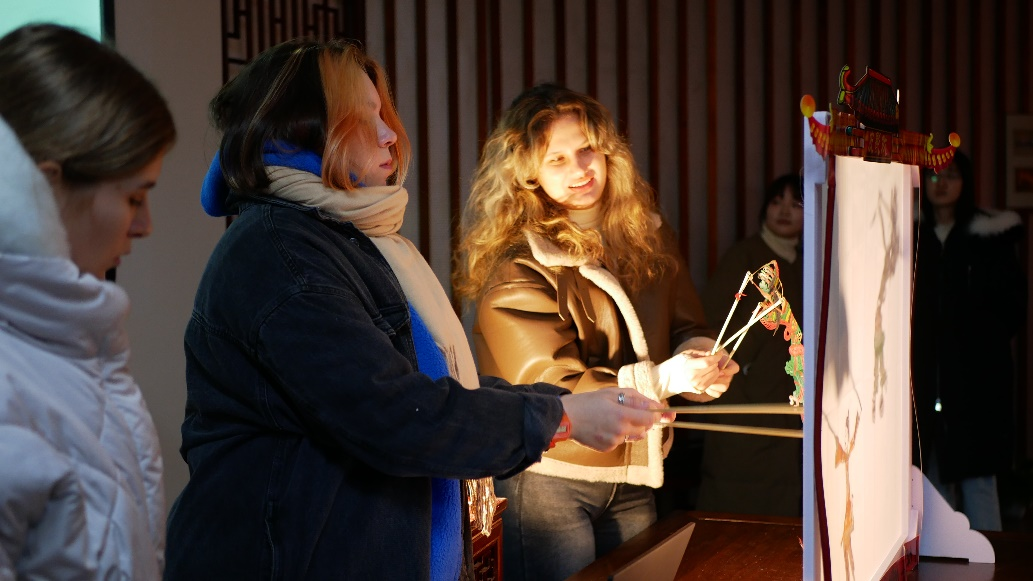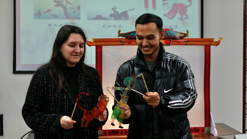 一层影窗,白幕透亮。皮影戏是中国传统戏曲艺术的一种,集工艺美术、文学作品、音乐创作、舞台表演等多种艺术元素于一体,历史悠久、源远流长。活动现场,留学生们亲身体验了《哪吒闹海》《年的故事》和《武松打虎》三部经典皮影剧目的演绎。光影交错中,一个个皮影人物在白幕上翻飞腾挪、活灵活现。伴随着传统曲调唱腔,每位学生都被皮影戏艺术的魅力深深吸引,现场气氛热烈。