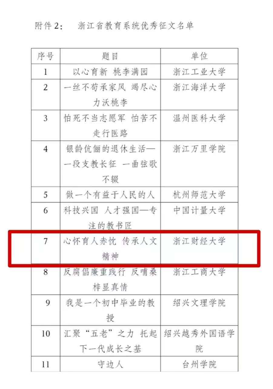 近日,浙江省教育厅关工委公布了2023年“读懂中国”活动入选作品名单。金年会“老少共话来时路 踔厉奋发新征程”实践团的作品《心怀育人赤忱 传承人文精神》入选浙江省教育系统优秀征文名单。