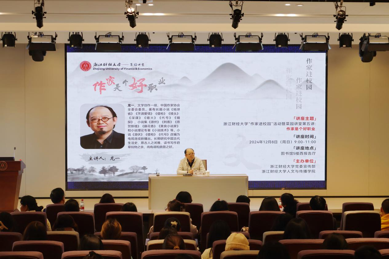 12月8日,“作家进校园”活动暨“菜园讲堂”第五讲在图书馆5楼西报告厅举行。著名作家、中国作家协会全委会委员龙一应邀作“作家是个好职业”专题讲座。党委宣传部、金年会jinnianhuicom相关负责人、图书馆、外国语学院等在校师生代表180余人参加活动。