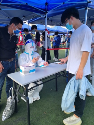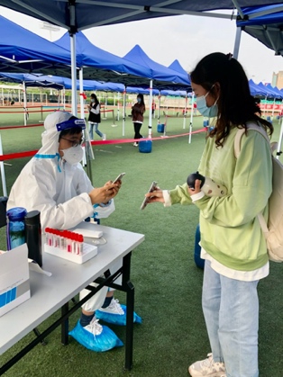金年会教工第一党支部党员苏浩、史婷婷报名参加4月20日和21日校集中核酸检测点的志愿服务工作。闷热的外部环境、身着防护服,近六个小时不吃不喝不上厕所,他们始终保持高昂的斗志和良好的精神状态,保质保量地协助各部门完成了学校全员核酸检测。