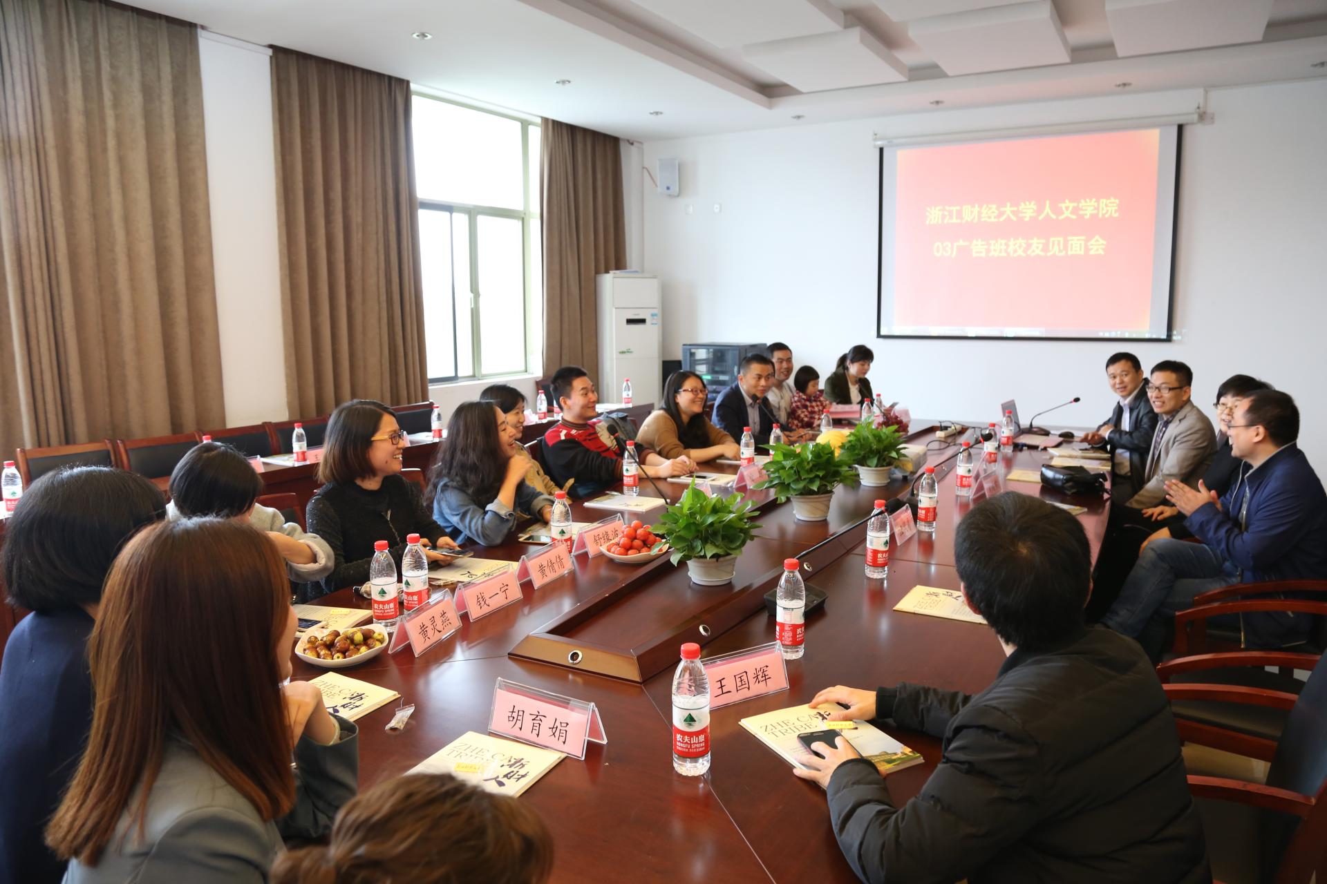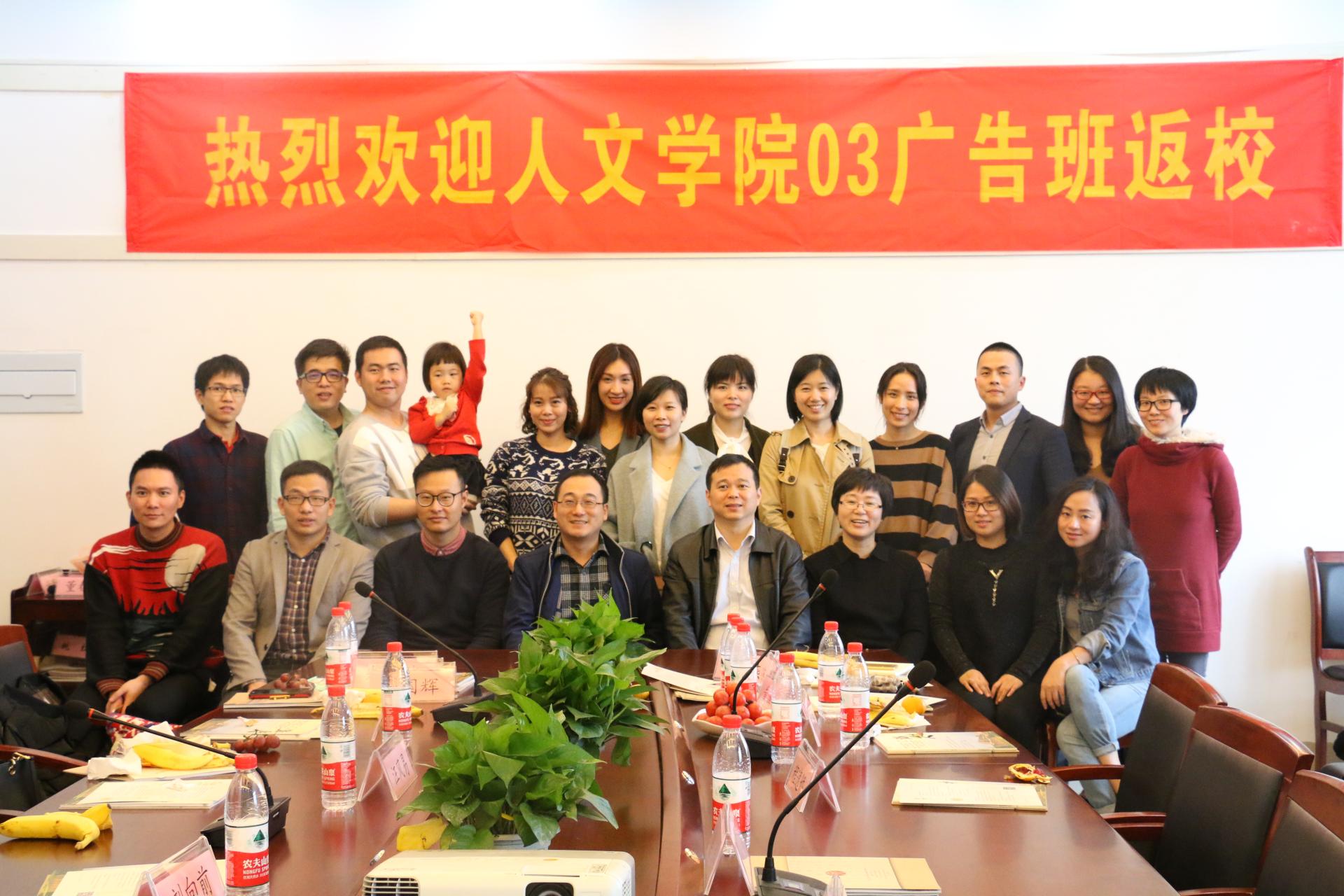 10月29日下午,金年会jinnianhuicom03广告班校友回母校聚会,并在学院楼404会议室召开座谈会,校友和在校师生齐聚一堂,共叙师生情谊,齐愿母校繁荣。03广告班的原带班辅导员、现数科学院党委副书记刘向前和现学生处干部汪风易特邀出席,金年会jinnianhuicom党委副书记吴玻、数字媒体艺术系系主任王文奇、校友联络员章立峰和03级广告班校友参加。