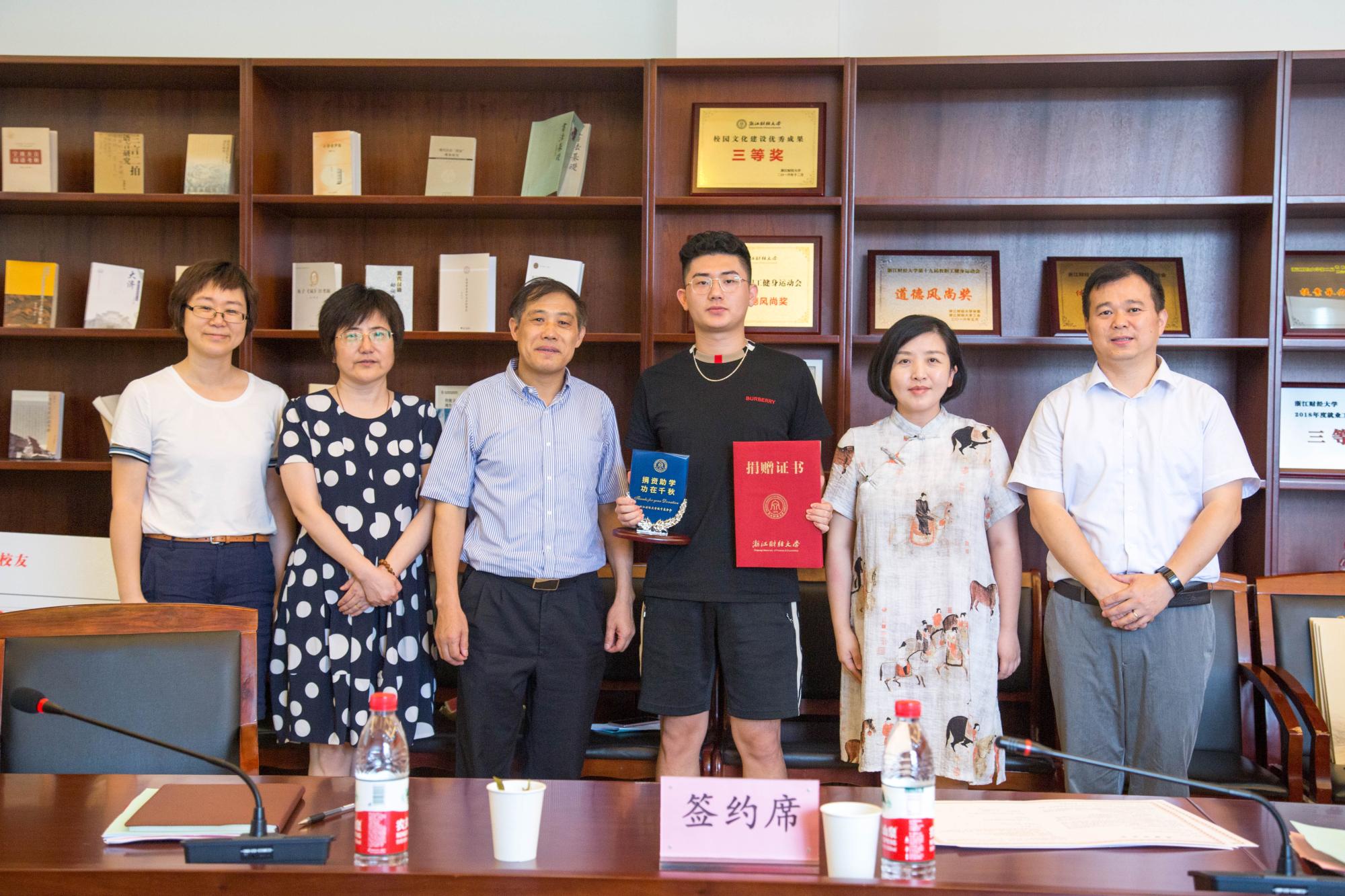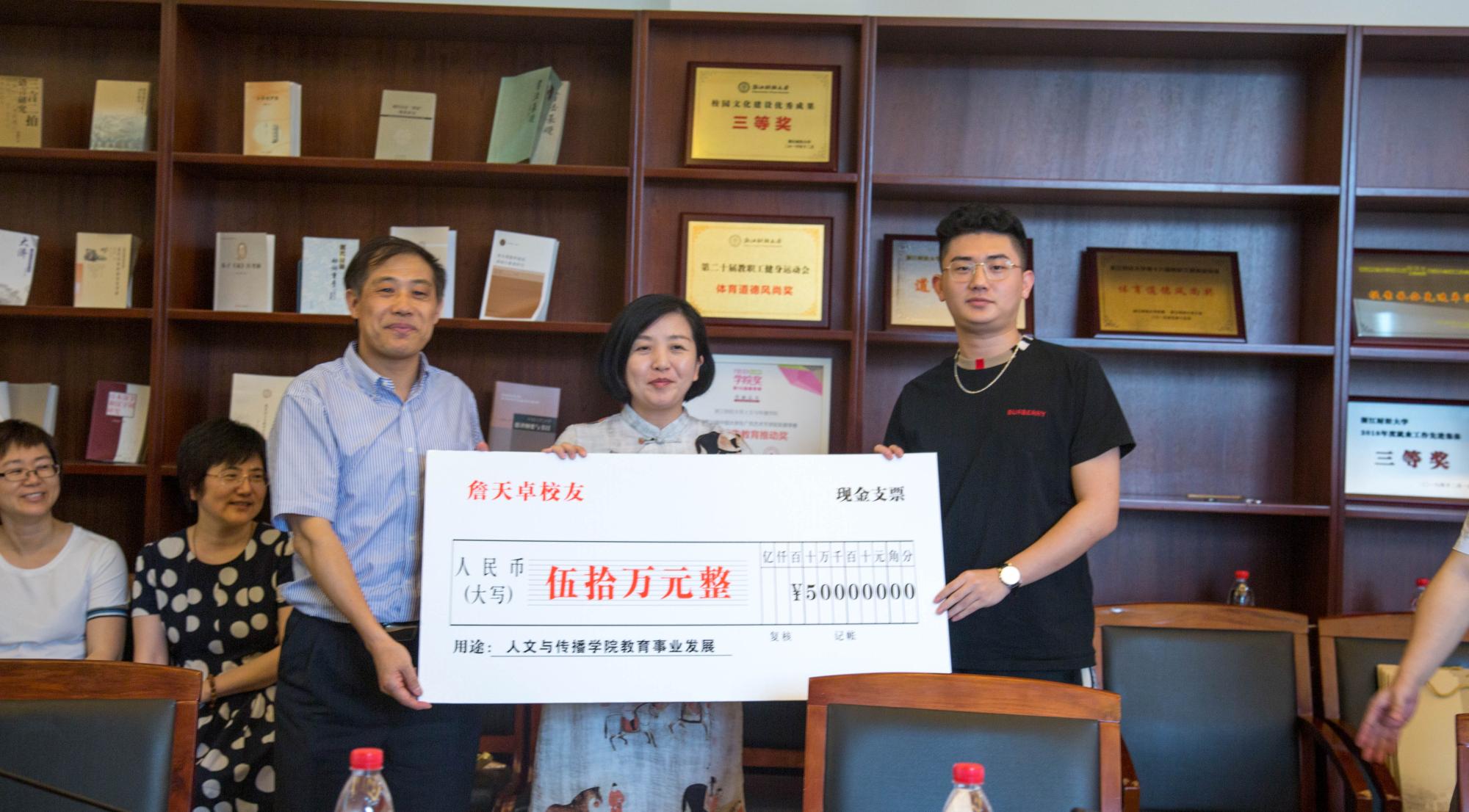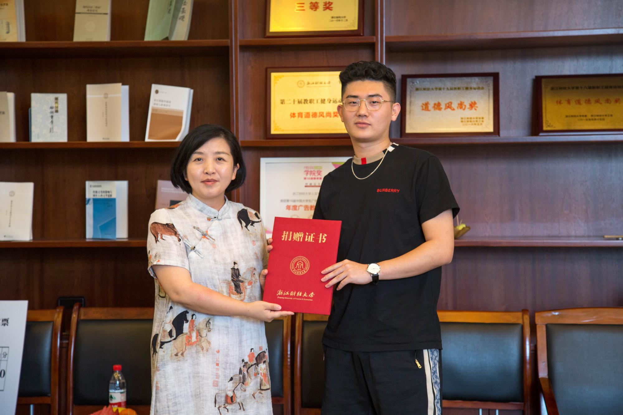 捐赠仪式上,院长何华珍和书记高燕代表学院接受了校友捐赠,高燕书记向詹天卓颁发了学校捐赠证书和纪念杯。