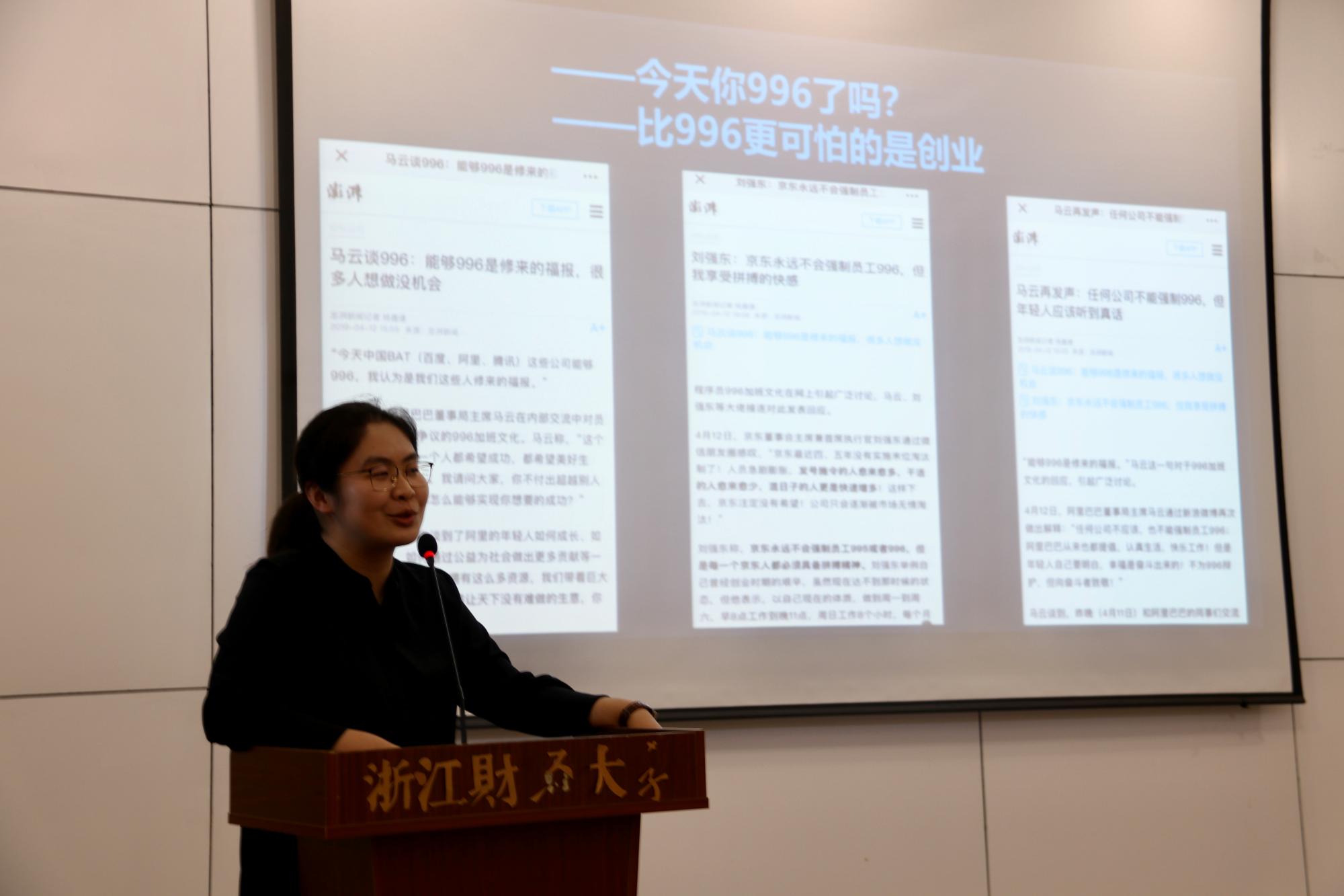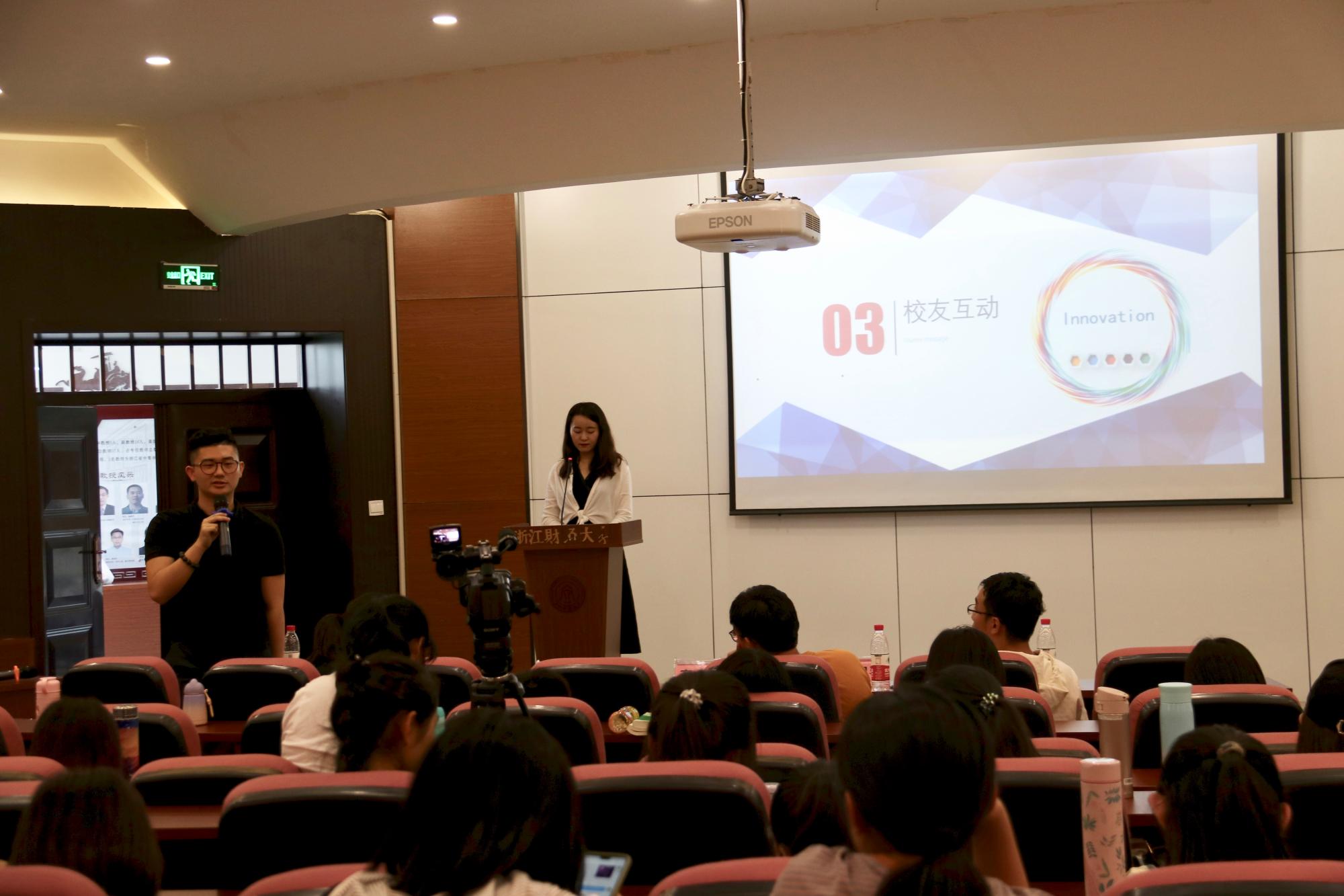 第二阶段,校友们纷纷与在校生分享了自己创业经历和创业故事。赵国强校友通过过讲述“做好两件事”“产品商业化”“合理分工”“定义成功”等七个主题向大家分享了他的创业感悟;张加林校友结合自身的创业经历和大学生活,声情并茂地对大家进行了创业经历;汤凯文校友从他的创业经历出发,分享了企业文化和企业定位,同时还强调了“合作”和“反思”在创业过程中的重要性;詹天卓校友风趣幽默地讲述了自己的从业和创业过程,向同学们强调了“做人”和“情商”在商场中的重要意义。在互动环节,同学们就大学阶段的专业学习对创业的影响,创业途径以及创业的生活节奏与校友们进行互动交流,四位校友结合自身经历,一一回答了同学们的提问。