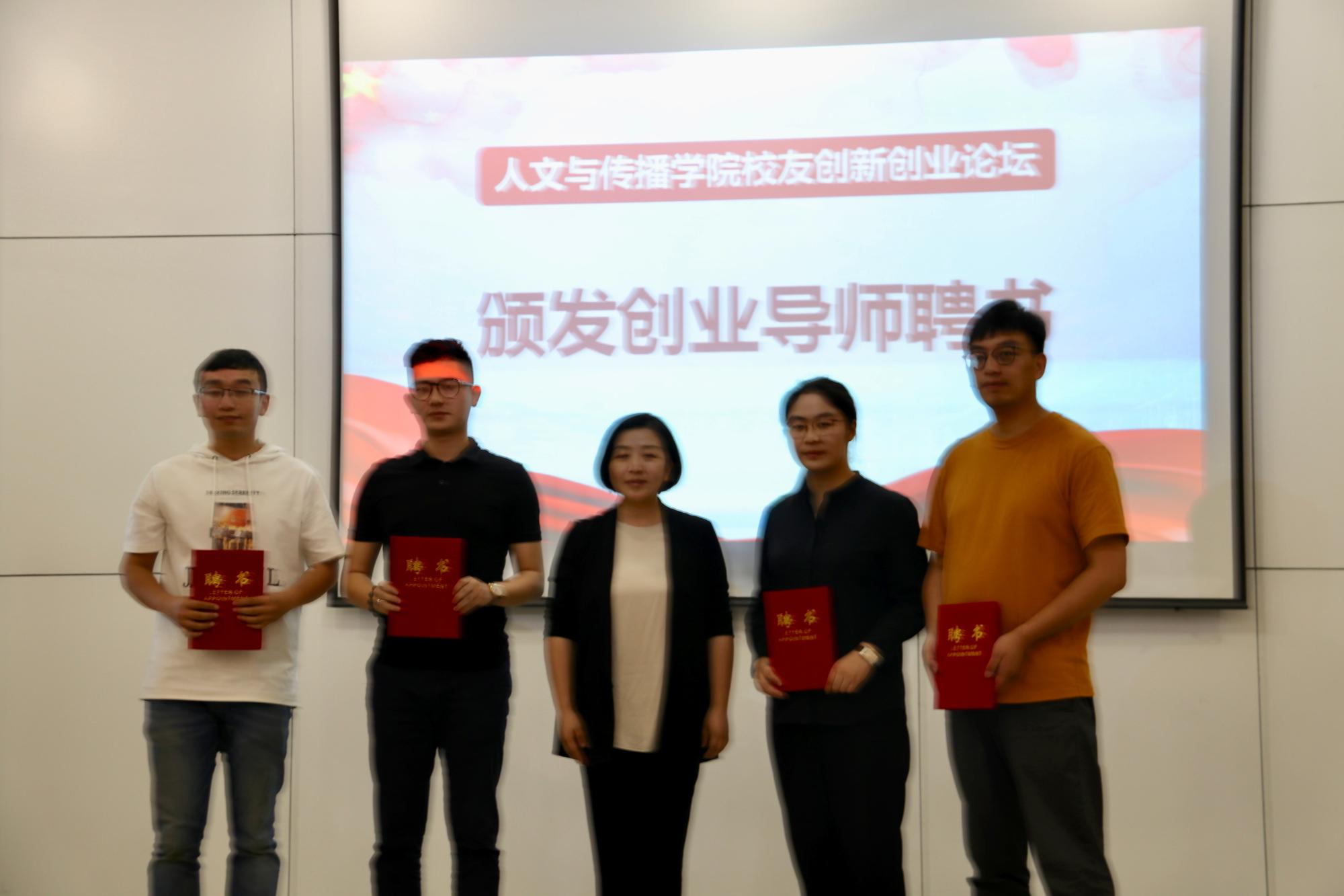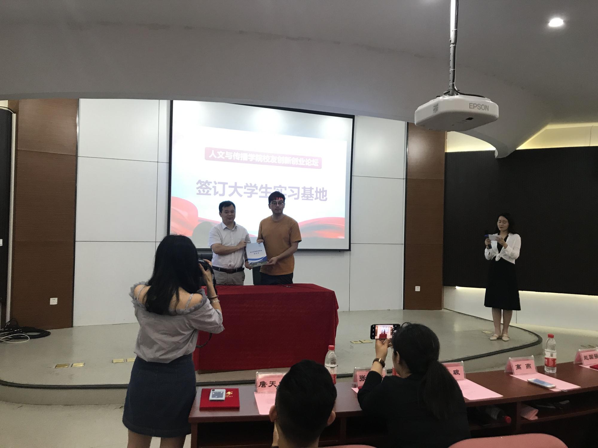 本次活动共分两个阶段进行。第一阶段,高燕老师代表学院致开幕词,她对各位校友的到来表示热烈欢迎和诚挚感谢,向校友们介绍了学院发展情况。她指出,学院的发展离不开校友们的关心和支持,希望通过本次活动的开展,进一步增进校友与学院的交流与合作,进一步促进高校与企业之间的协同育人,让创新创业的“种子”在更多青年学子心中生根发芽,并希望各位校友继续关注、关心学院和学校发展,搭建平台,提供资源,为学校创新创业教育和人才培养作出更多贡献。随后,高燕书记为校友们颁发了创业导师聘书和45周年校庆邀请函,吴玻副书记与浙江智匠影视文化有限公司创始人赵国强签订了大学生实习基地。