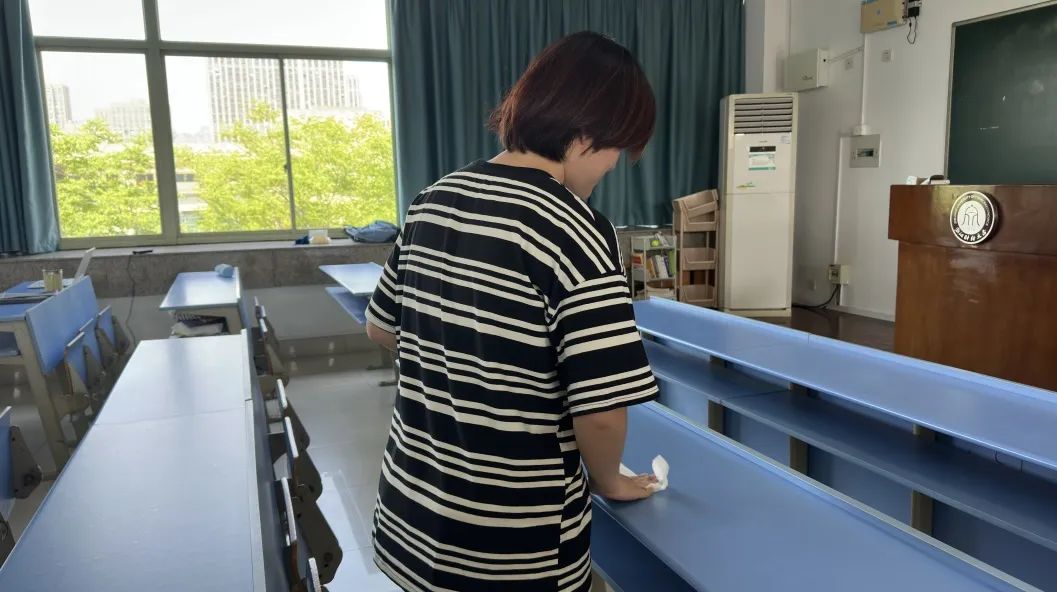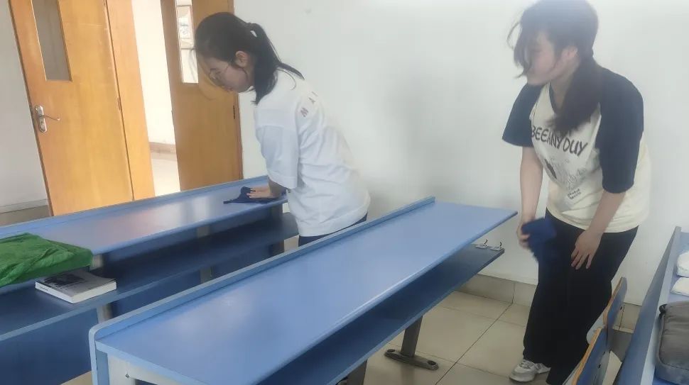 在后勤阿姨的指导与帮助下,生活权益部的同学们有序行动:或手持湿润的抹布反复拭去桌面沉积的胶印;或掏出桌内废旧物品进行回收;或二人合作擦拭门窗;或将地上的垃圾扫入簸箕;或用拖把拖去残存的水痕……清扫全程安静有序,大家专注工作,配合默契。灰尘污垢悄然消失,整个教室焕然一新。