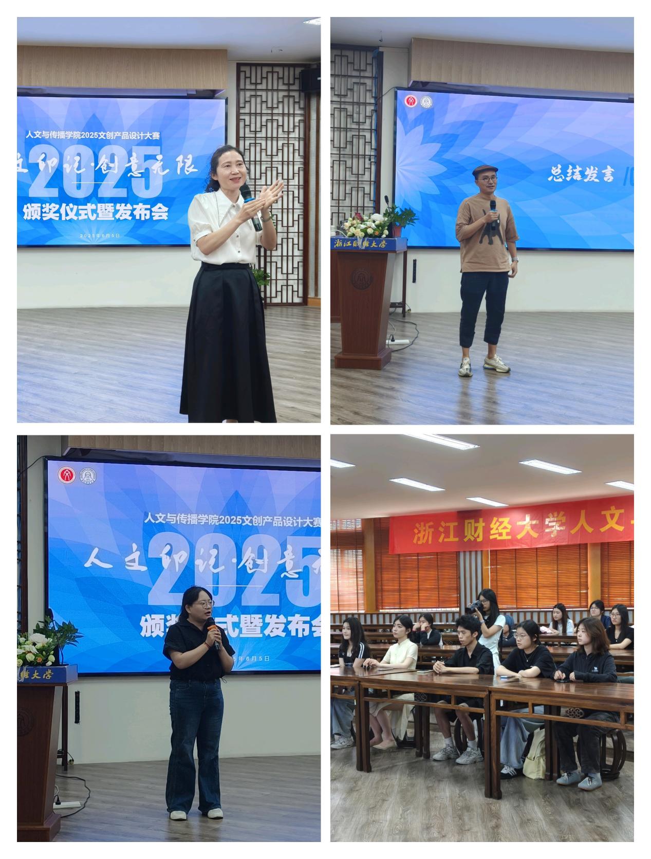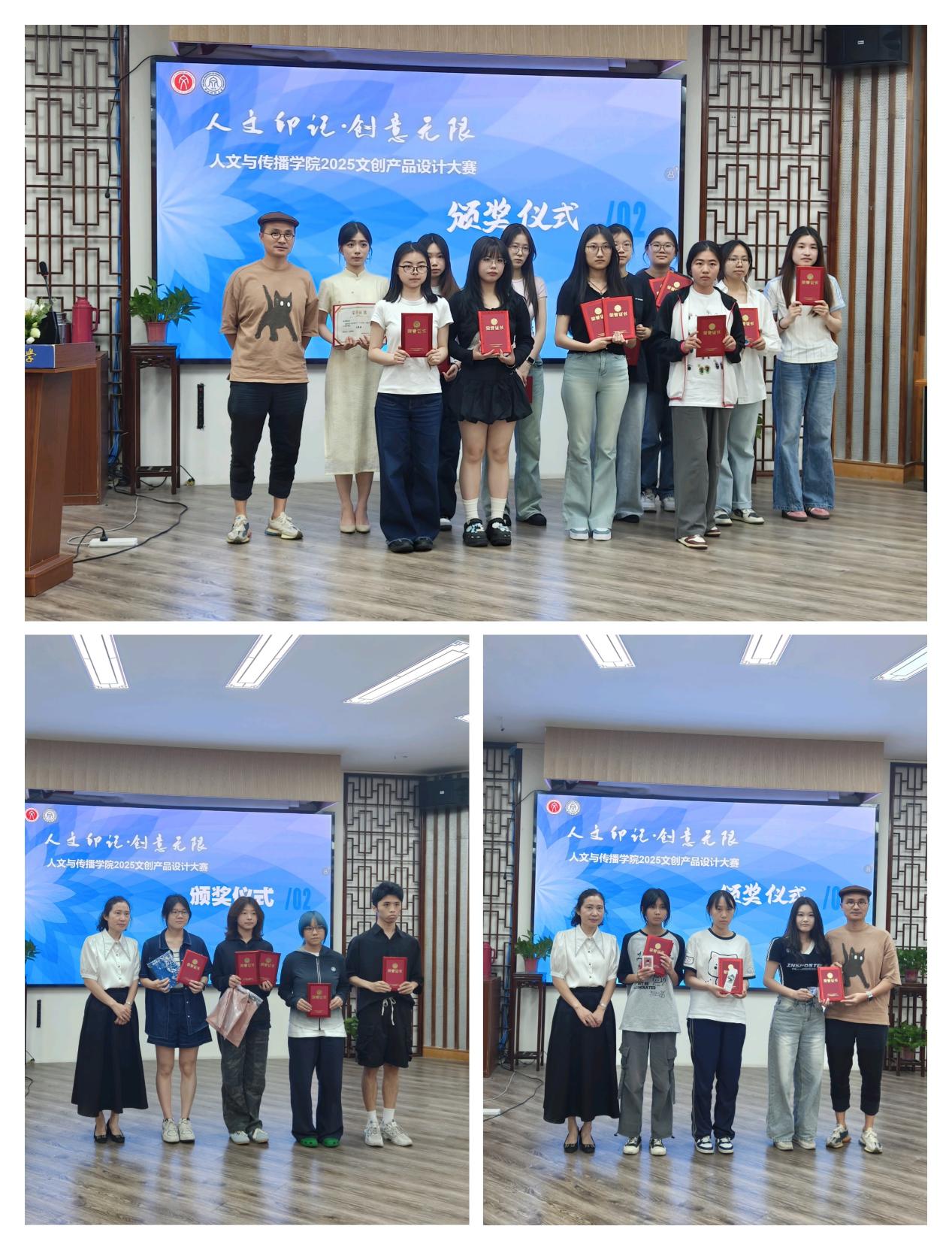 6月5日中午,金年会jinnianhuicom“2025文创产品设计大赛颁奖仪式暨发布会”在学院楼问津书院隆重举行。本次活动以“人文印记·创意无限”为主题,学院党委书记罗金艳、金年会广告学专业设计师董建华老师出席并为获奖同学颁奖。