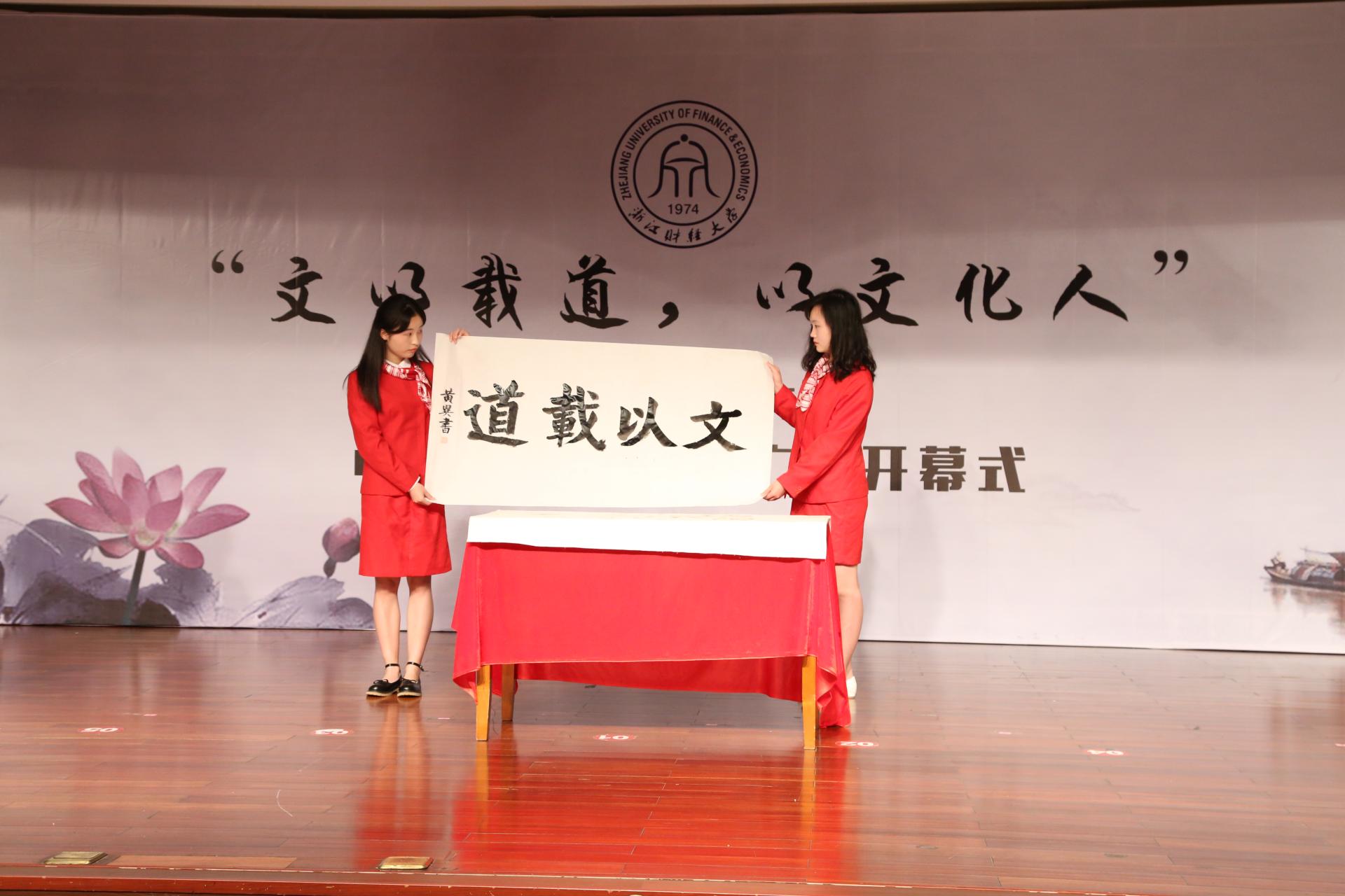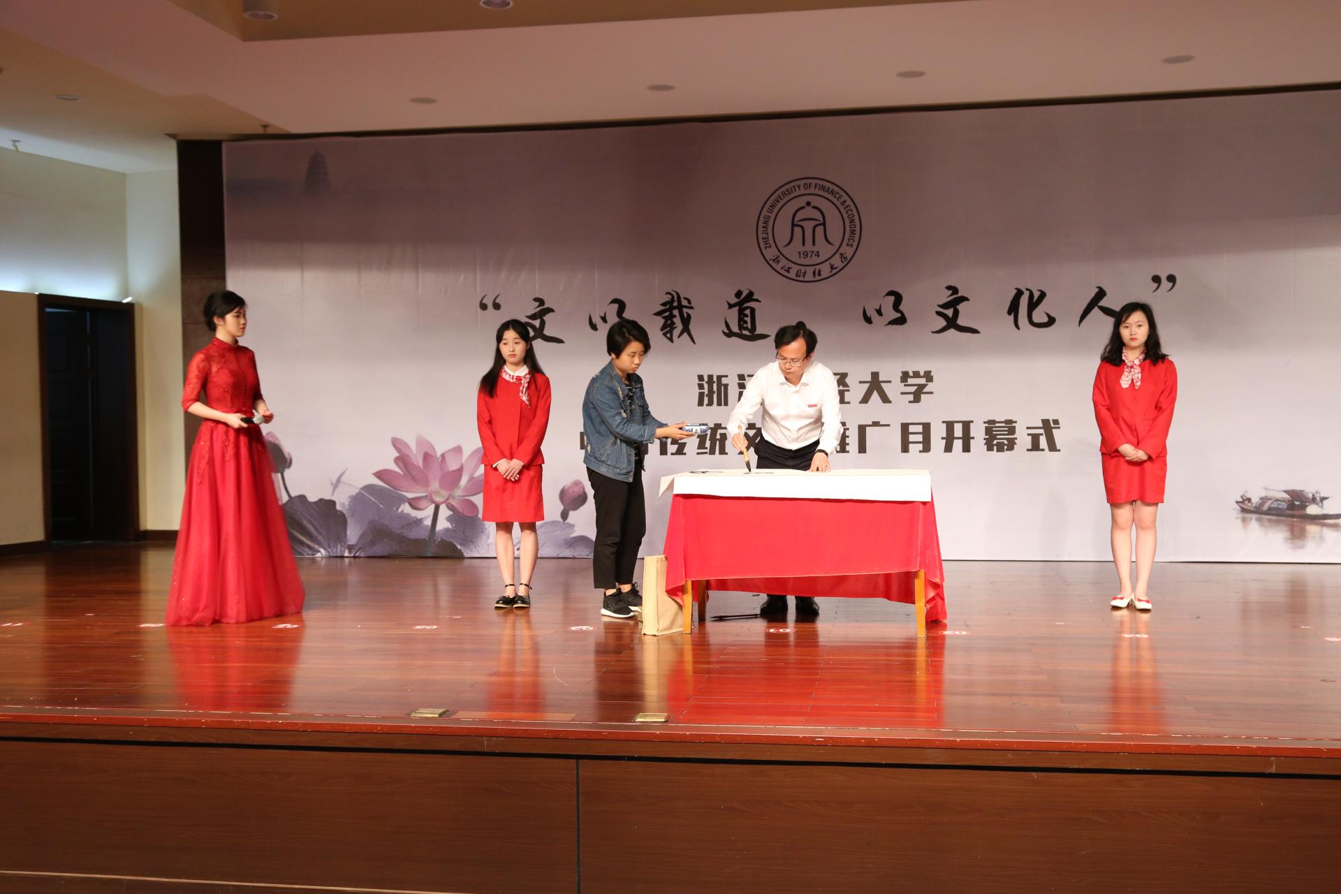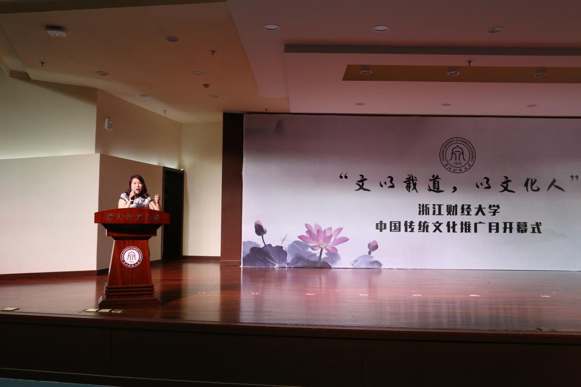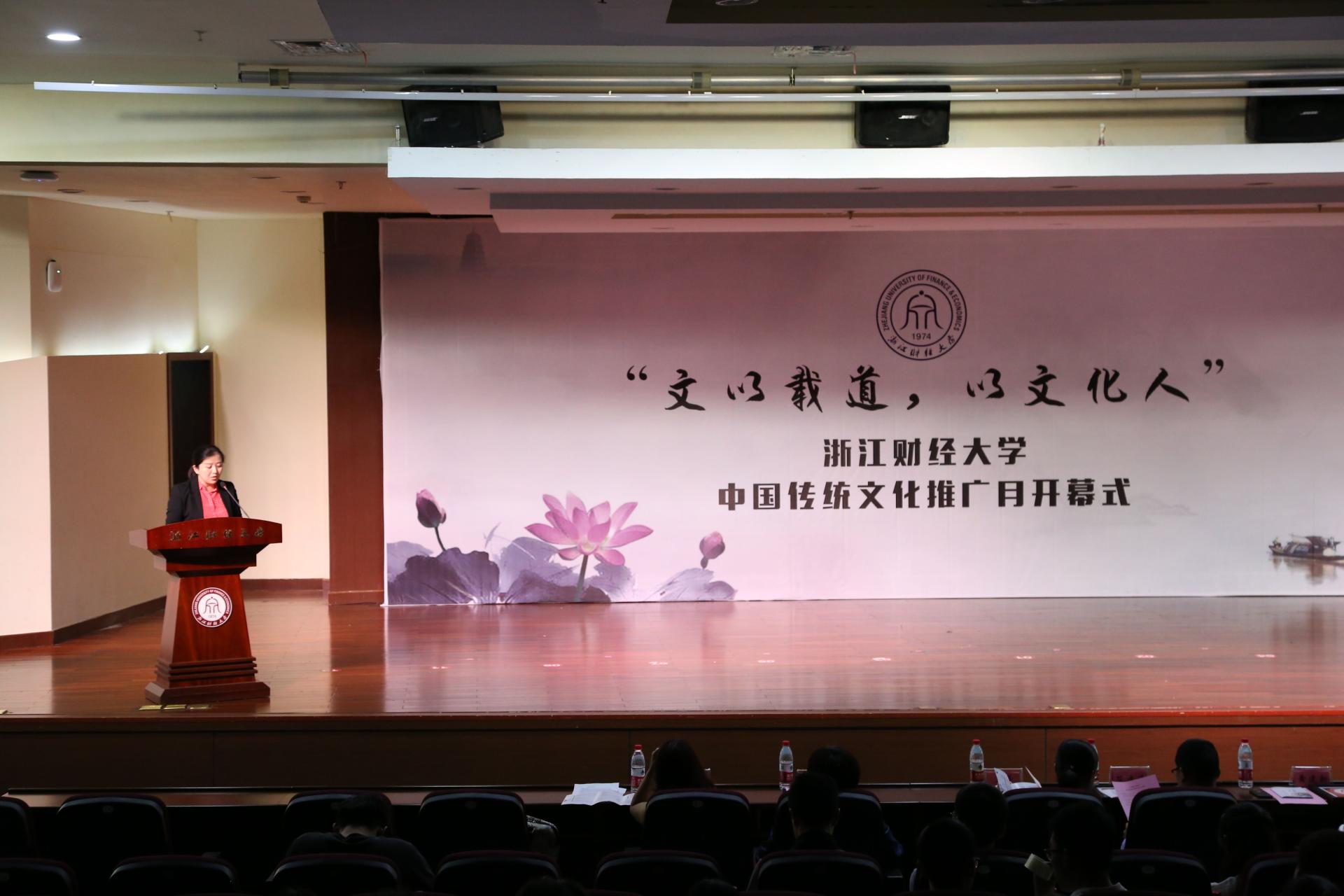 2017年4月20日下午1点30分,“文以载道,以文化人”浙江财经大学中国传统文化推广月开幕式在学术中心第一报告厅举行。党委委员、副校长黄建新出席本次开幕式。党委宣传部、学工部、团委、研工部、金年会jinnianhuicom的领导以及各学院团委书记和500余名师生代表共同参加了本次开幕式。