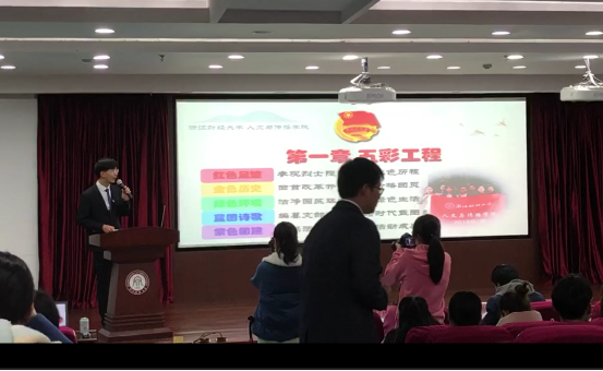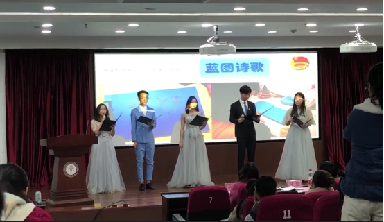 2018级文传(1)班班长兼团支部副书记郭继同学以《新时代、新青年的“五彩工程”》为主题,向在场评委和观众展示了班级团支部开展的“红色足迹”、“金色历史”、“绿色环境”、“蓝图诗歌”和“紫色团建”五大特色活动。六名同学现场朗诵了支部自己编写的歌颂红船精神的“蓝图诗歌”,充分展现金年会jinnianhuicom的专业特色,展示了金年会团员青年的精神风貌和团支部活力建设的优秀成果。