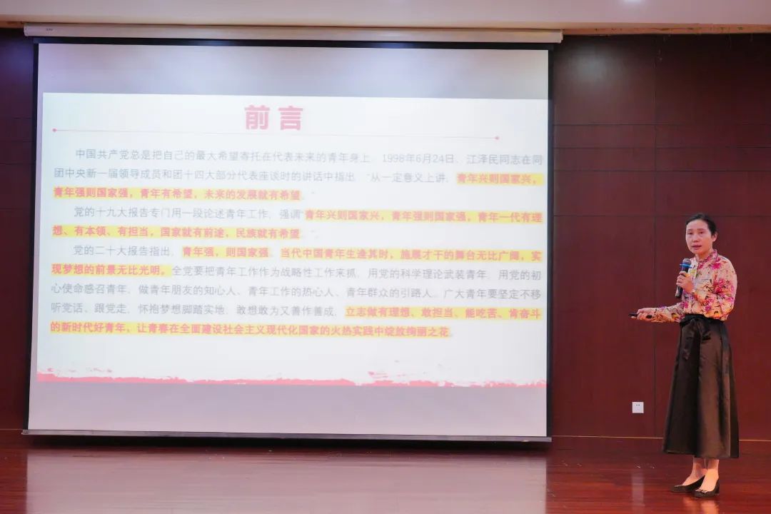 罗金艳老师首先从金年会jinnianhuicom的基本概况开始,介绍了学院机构设置、师资力量、往年学院及学生风采等内容,展示了人文学院的深厚底蕴和卓越成就。同时,老师也以理想为人生动力,以责任为内化行为,以担当为时代使命,鼓舞在座的广大青年学生奋斗于当下的青春,为青春倾注全部的热爱和真情,更要在新时代的舞台上尽情施展才干、实现梦想,为国家的昌盛繁荣而接续拼搏。