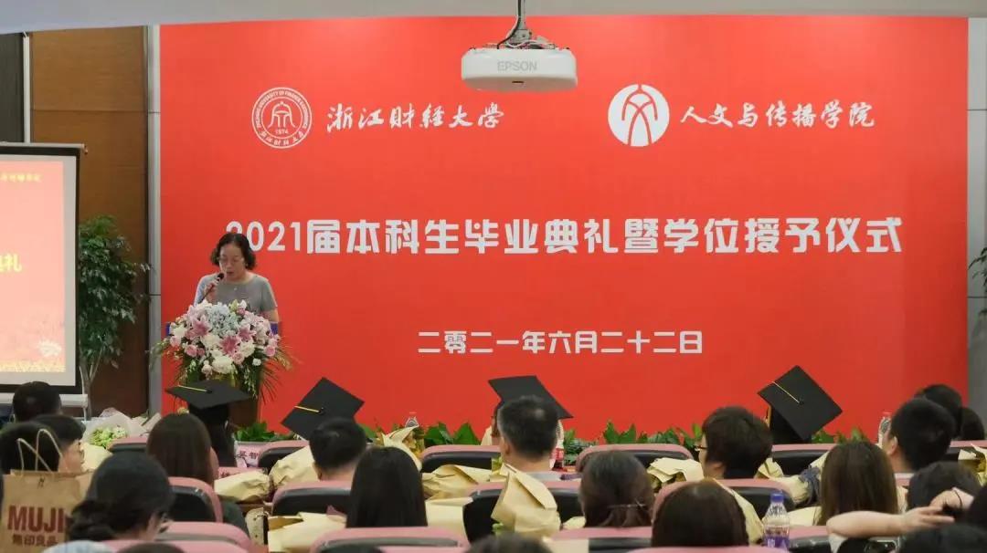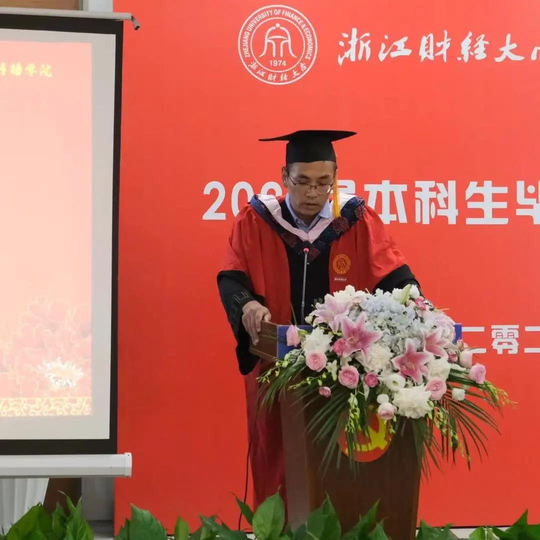 毕业典礼由周保欣院长深刻真诚的致辞开场。“我们生活在一个动荡的世界,走在一条未知的路上。不管这个世界如何变化,我们都要以不变应万变,坚定自我的方向和目标,用人类文明和价值理性塑造我们的生活。”在未来的人生道路上,周院长勉励各位同学建立自我的价值生活,直面生活的苦难,通过文学丈量生命的时间,矢志追求更有高度、更有品味的人生。临近毕业之际,周保欣院长欣慰地感慨:“江山代有才人出,相信你们会具有比我们更优秀的潜质和禀赋,你们会比我们做的更好。”希望同学们在浙财的求学经历成为前途坚实的路基,在学院结识的良师益友成为沮丧和迷惘时温暖的支柱。