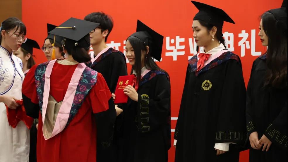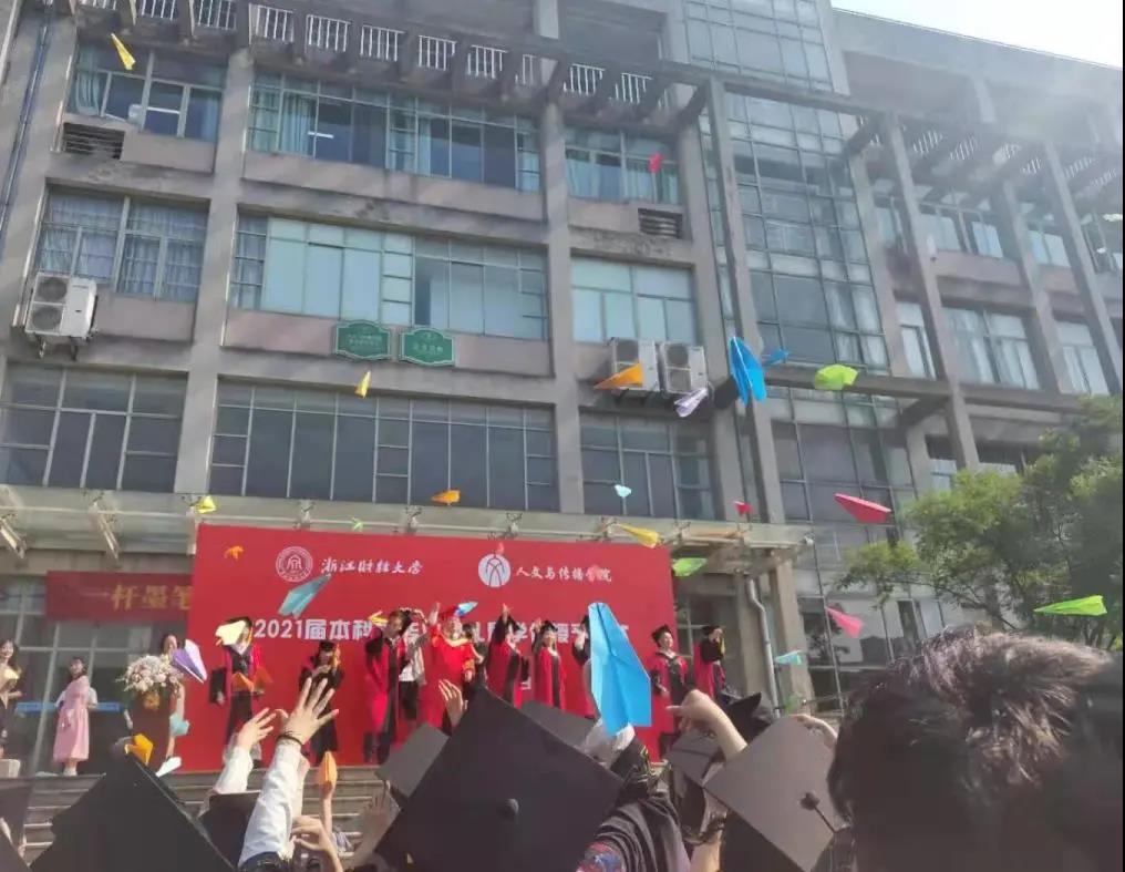 浙江财经大学副校长徐晓东,人文学院院长周保欣、党委书记高燕、副院长陈静、院长助理吴智斌、中文系赵顺宏、国际汉语系杨建忠、广告系胡文财、网络与新媒体系洪艳等九位老师身着导师服上台,与受礼的毕业生依次握手,并为他们颁发学位证书和拨穗。四年上下求索,满获沉甸甸的知识,人文学子已如麦穗般成熟。将流苏从右拨至左这一个动作,将学子们的青葱岁月、求学生活悄悄翻过,他们的人生也从此进入了崭新的篇章。在仪式的最后,各位领导老师和全体毕业生们手执彩色纸飞机,在学涯湖畔,让梦想随着纸飞机飞向远方。