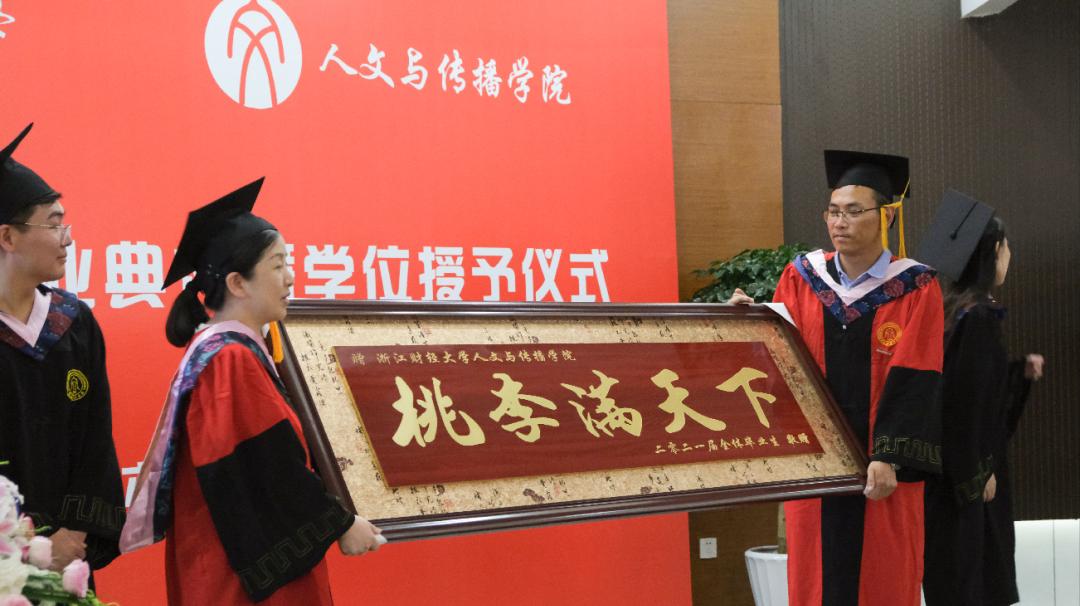 为了感谢学院四年以来的精心培养,2021届全体毕业生满怀感恩之心,向学院赠送了题为“桃李满天下”的牌匾,作为他们送给金年会jinnianhuicom的礼物,以此表达对学院的眷恋之情,对老师辛勤工作、谆谆教诲的无尽感激,对人文学子的真挚鼓励。周保欣院长和高燕书记代表金年会jinnianhuicom接受了牌匾并合影留念。
