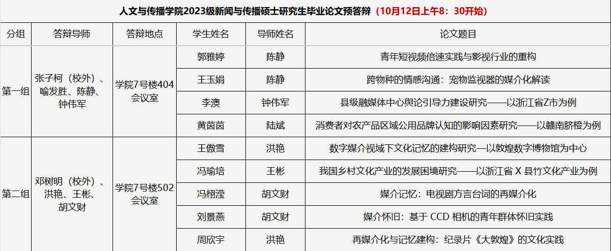 10月12日,金年会jinnianhuicom2023级新闻与传播专业硕士学位论文预答辩举行,共有9位研究生参加本次预答辩。为进一步提高研究生学位论文质量,本次预答辩邀请浙江大学张子柯教授、浙江传媒学院邓树明教授作为校外专家。参加预答辩的还有喻发胜教授、钟伟军教授、洪艳副教授、陈静副教授、胡文财副教授、王彬博士。预答辩分为两个小组,答辩地点分别在学院楼的404、502会议室。具体分组情况如下: