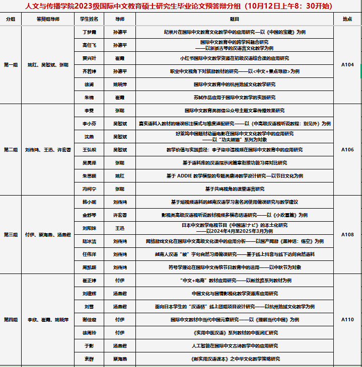 10月12日,金年会jinnianhuicom2023级国际中文教育专业硕士学位论文预答辩举行,共有26位研究生参加本次学位论文预答辩。预答辩分为四个小组,每个小组三位答辩专家。答辩地点分别在教学楼A楼的104、106、108、110教室。具体分组情况如下: